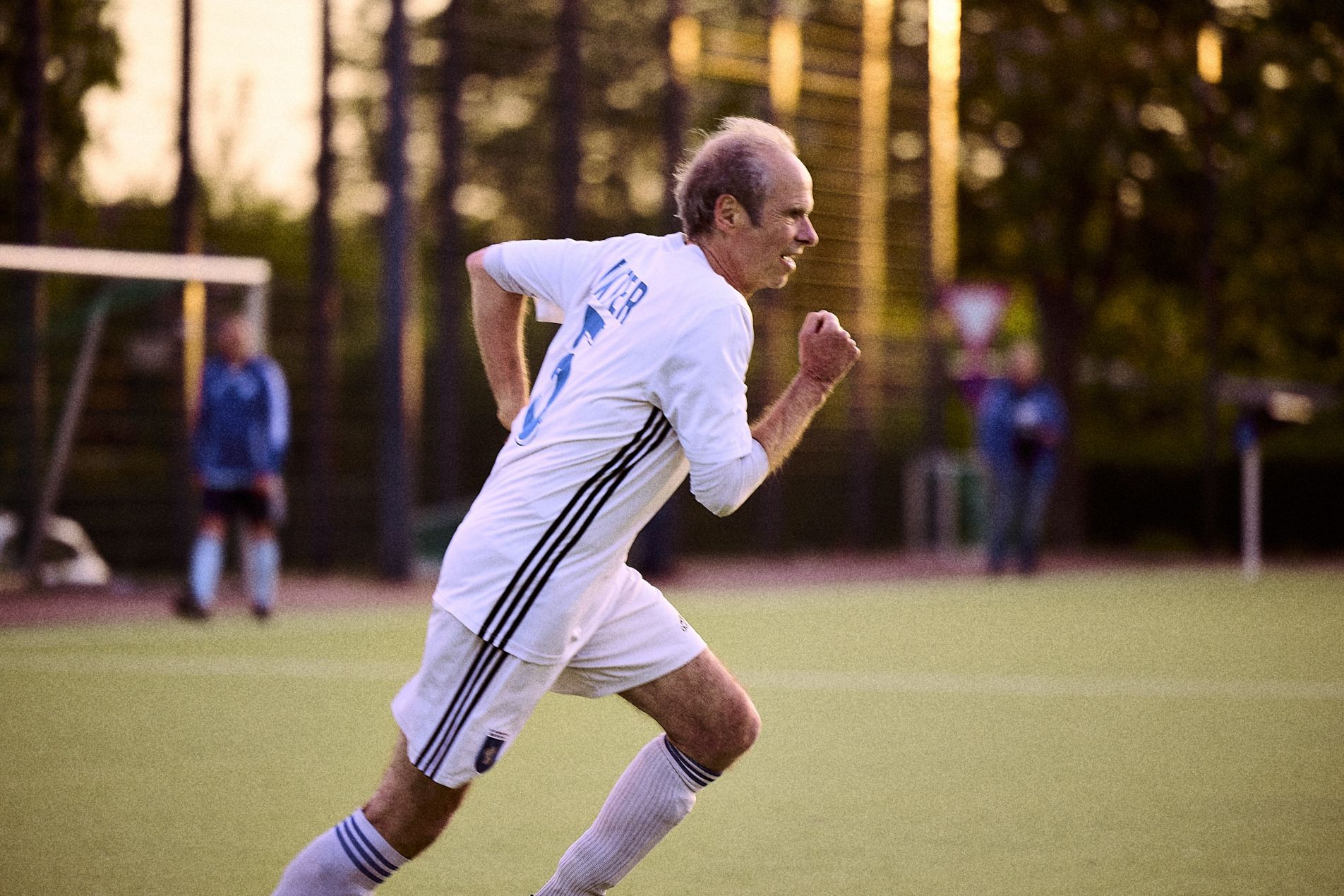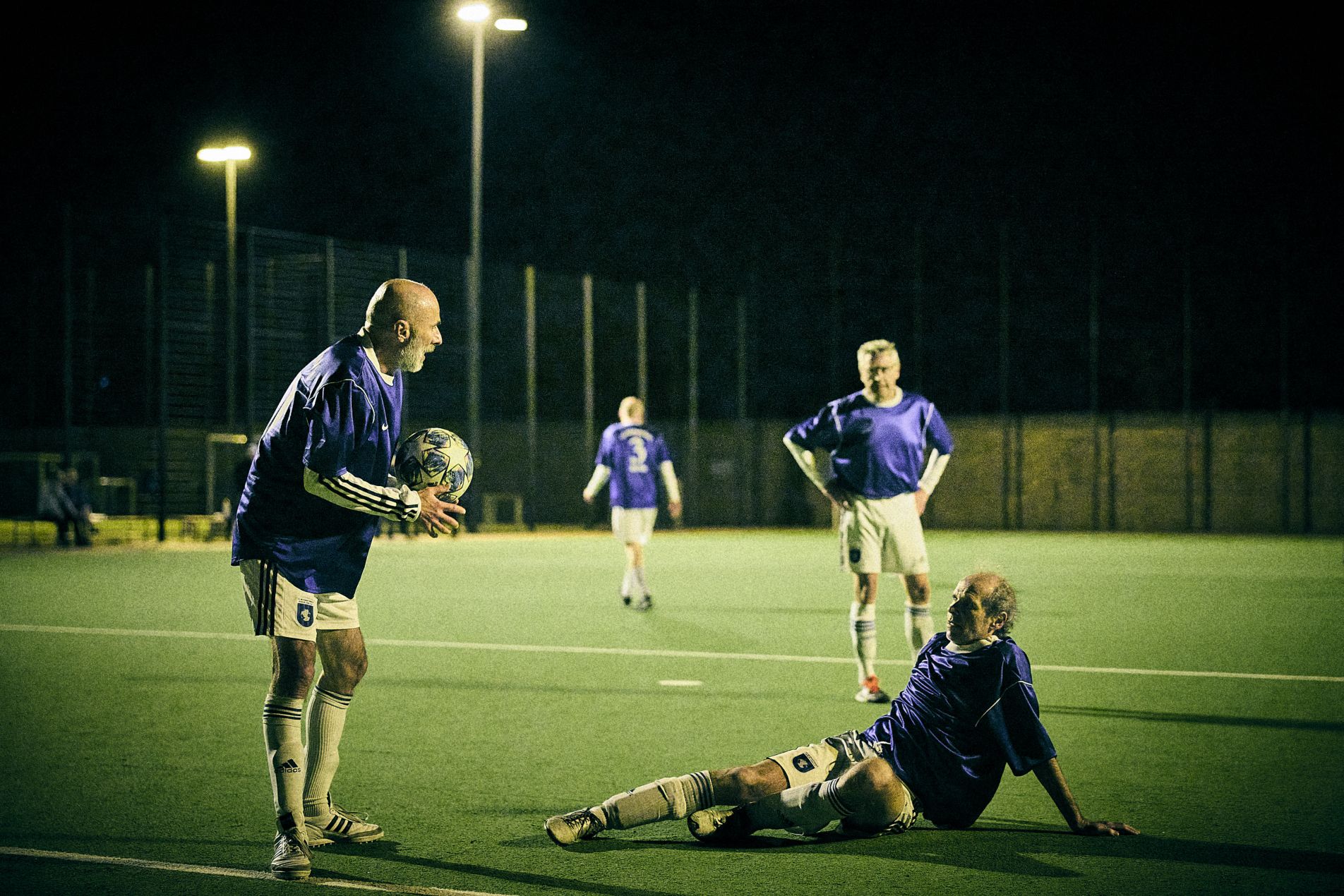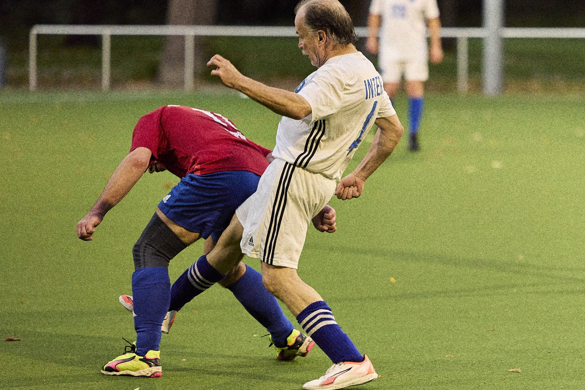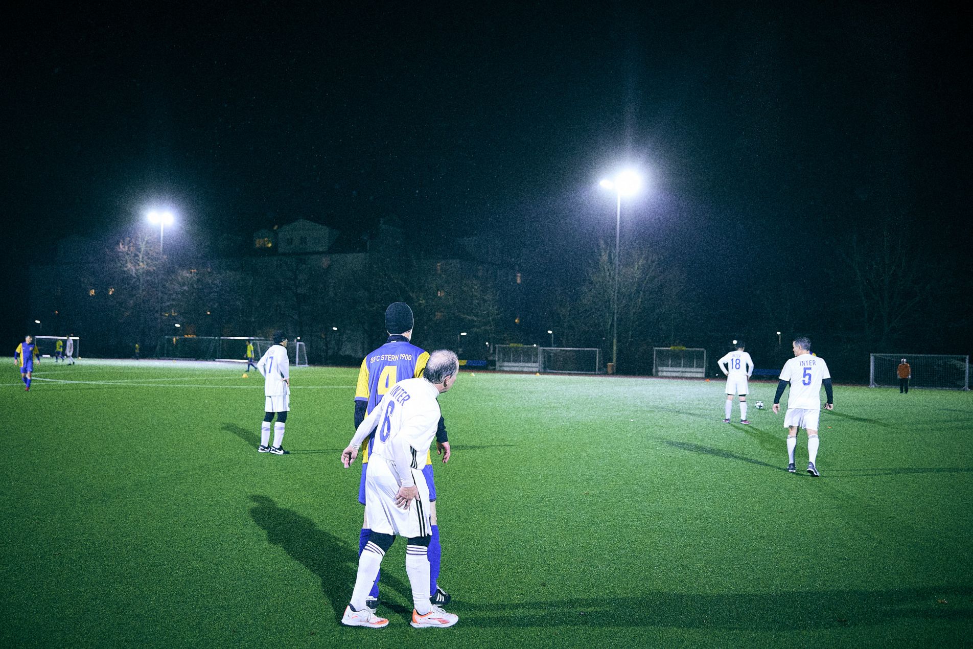Herren über 60 in kurzen Hosen. 6 + 1 auf Kleinfeld. Flutlicht. Tannenbaum.